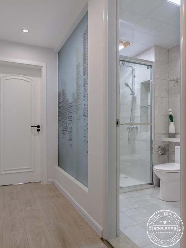 衛生間外墻嵌入大面積磨砂玻璃增加通透感,一堵實墻就壓抑很多。衛生間里的壁龕設計,也為淋浴房加分不少。