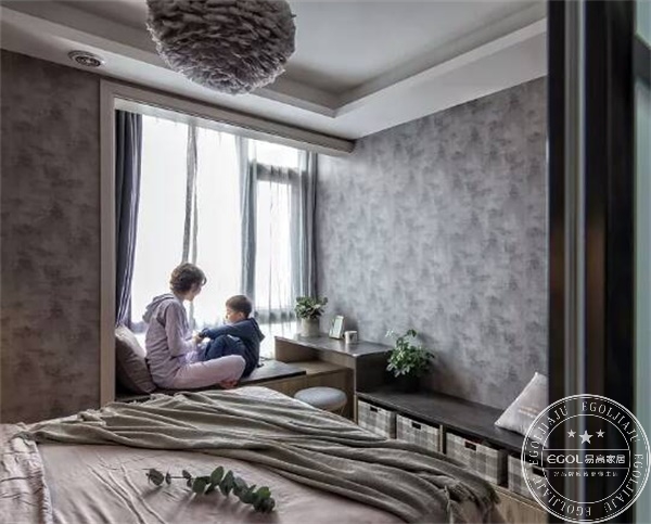 柔和的色調(diào)讓整個(gè)臥室空間顯得靜謐,在飄窗位置專門設(shè)計(jì)彩妝臺(tái),看著十分幸福溫馨。